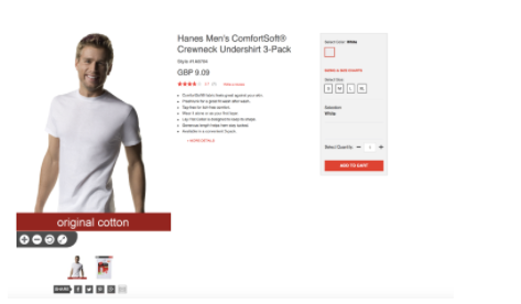 Take for instance this simple white t-shirt on a professional model, alongside the standard list of product information.